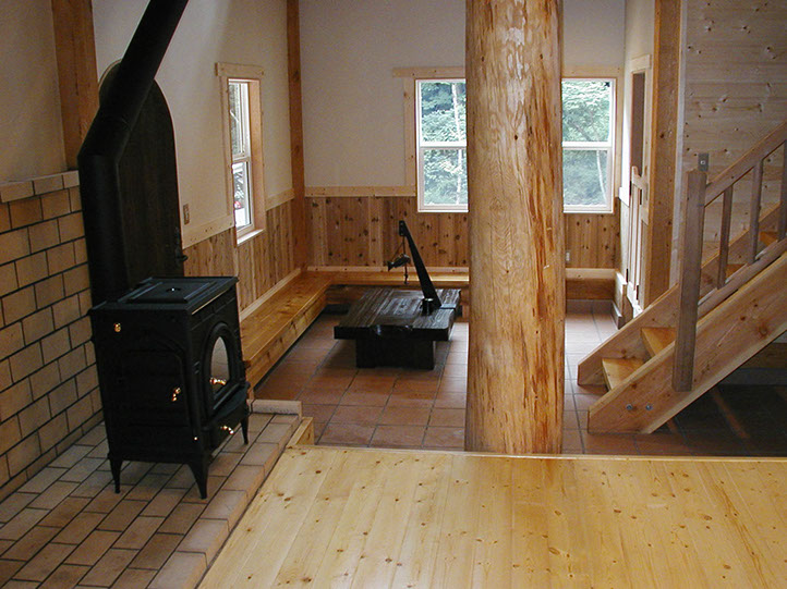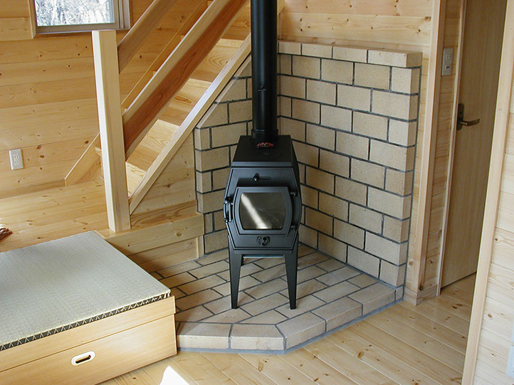 薪ストーブは暖気対流・排煙効率を重視した位置に。