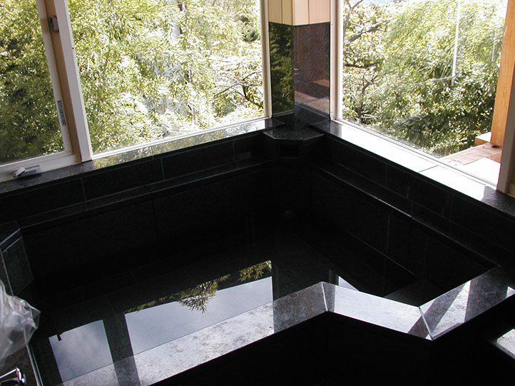 国産ヒノキの壁と十和田石貼り・どっぷり肩まで浸かれます。