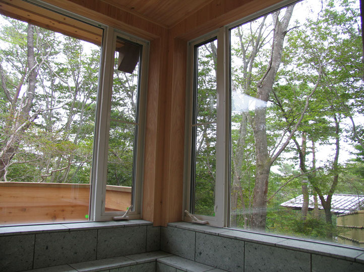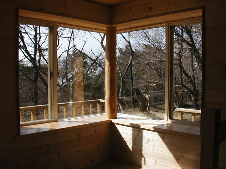 木々の葉が落ちる冬にたっぷりの日差しが確保できるようコーナー出窓を採用