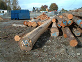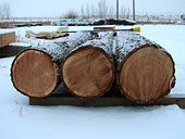 木材の安定供給を目指し開業当初から「乾燥原木確保」プログラムをカナダにて実施し、主に翌年計画されるプロジェクト用にストックをしています。皮を剥いて原木のまま6ヵ月以上経過させた木材はゆっくりと自然乾燥されてとてもいい状態となります。そのようにして供給されるティンバーフレーム用ダグラスファーやウェスタンレッドシダー、イエローシダー材はどれも大変ご好評を得ています。
