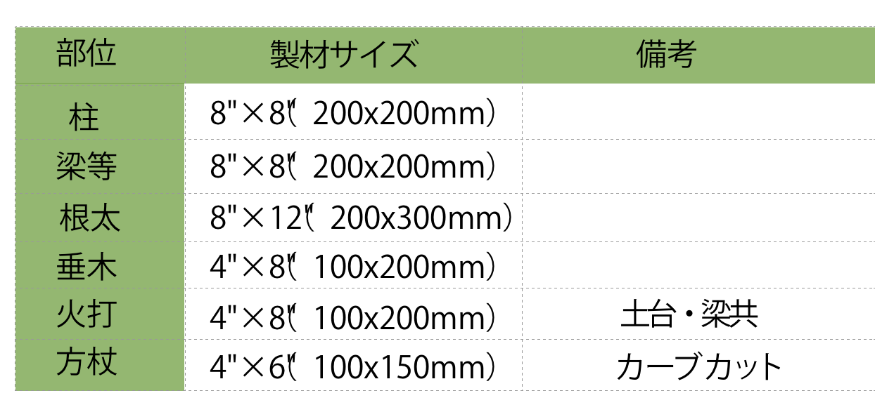 各部の製材サイズは下表のようになり、標準的なこのティンバーフレームでは平均スパンを4000mm(最大6000mm)としています。