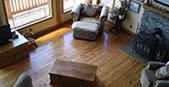 ティンバー材と同じダグラスファーの幅広床材に小上がり畳スペースがあるリビング